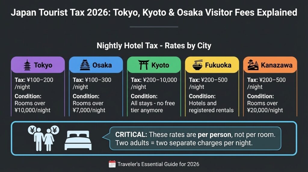Tokyo 100–200 yen Rooms over 10,000 yen/night Osaka 100–300 yen Rooms over 7,000 yen/night Kyoto 200–10,000 yen All stays – no free tier anymore Fukuoka 200–500 yen Hotels and registered rentals Kanazawa 200–500 yen Rooms over 20,000 yen/night