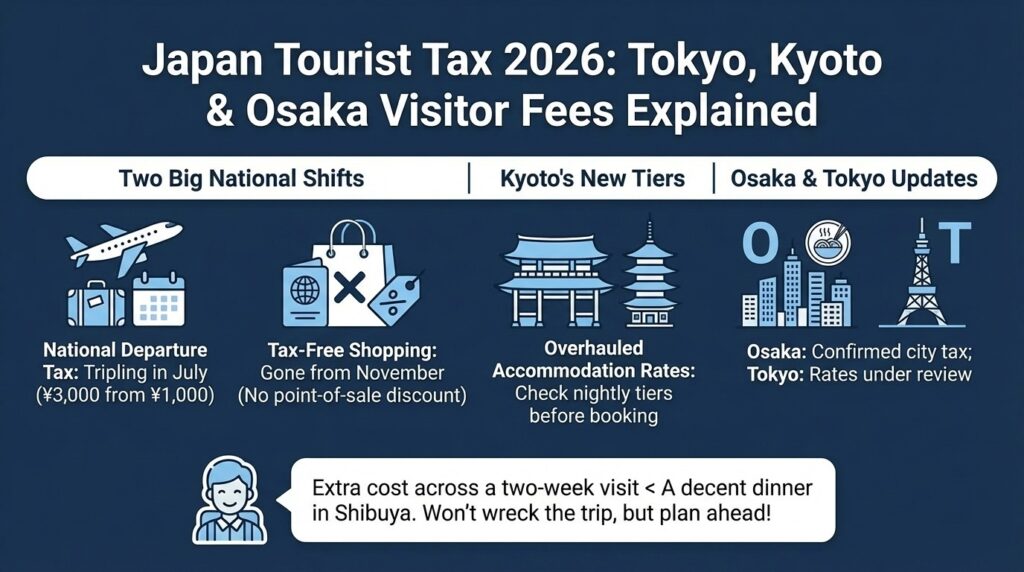 Two big shifts define 2026. The national departure tax is tripling in July. And Japan’s beloved tax-free shopping system, the one where you flash your passport and pay ten percent less on the spot, is gone from November. Add in Kyoto’s completely overhauled accommodation tiers, and there’s a fair bit to unpack before you book anything.