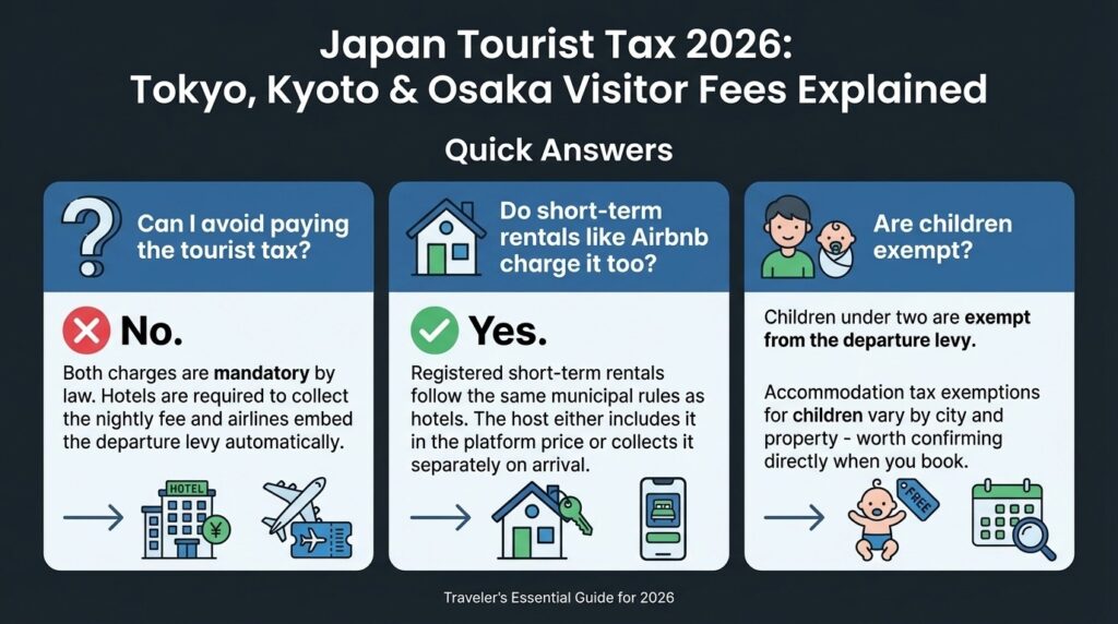 The departure levy is invisibly built into your ticket; there’s nothing to do on your end. The nightly accommodation tax is either collected at online checkout (check the itemised total on your booking confirmation) or added to your hotel bill when you leave. Most big city hotels and international booking platforms handle it upfront now. Smaller traditional ryokans sometimes prefer cash for this specific charge even when they take cards for everything else, so keeping a few hundred yen in notes handy is genuinely useful.